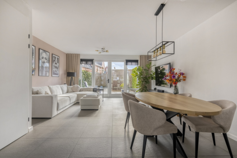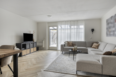De woonkamer en keuken vormen samen één geheel. De woonkamer van 29,3 m² voelt licht en ruim aan door de grote raampartijen aan de voor- en achterzijde. Aan de voorkant is een gezellige zithoek met tv-meubel en hoekbank ingericht. Achterin is er voldoende ruimte voor een grote eettafel – ideaal voor lange diners of gezellige spelletjesavonden.